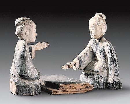 出土于西漢晚期48號墓的六博俑,包括一件棋盤、兩件俑。棋盤長29.2厘米,寬19.3厘米,呈長方形,黑色涂底,上面繪有白色“規(guī)矩紋”圖案,好似棋格;木俑高28.5厘米,為兩位跪坐相向對弈的老年男性。身著右衽長袍,梳圓髻,留胡須,全身以黑白為主色。