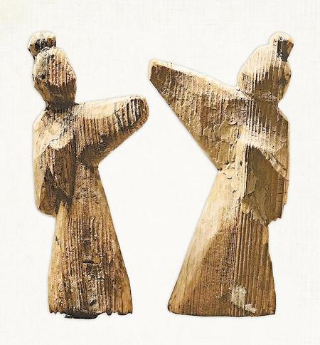 舞俑有獨舞俑和對舞俑兩種組合,舞者主要通過手臂的屈伸表現(xiàn)出舞蹈姿勢。通常先雕出舞俑姿態(tài),然后以白色為底色,用墨線和紅線繪頭發(fā)、衣袖,下垂處呈圓角方形。面部五官基本被省略,主要突出的是動態(tài)的翩翩舞姿。高度通常在20厘米左右。