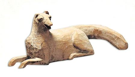 狗俑長度在14-24厘米左右。先雕刻出輪廓,墨色線條勾出眼、耳及身上的毛發(fā),造型多樣,且以臥木狗俑較多,雙耳豎立,頭搭在前伸的雙腿或前爪上。這其中不僅有原木色作底、墨線勾勒的臥姿木狗俑,還有通體施白漆,墨線描繪耳、嘴、眼、前爪及背部、尾部的鬃毛,雕刻成分甚少,無任何肢體動作,卻唯獨將雙耳豎起,展現(xiàn)警覺性的臥姿木狗俑。