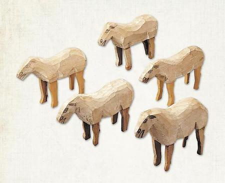 木羊俑長度為18-20厘米。皆以白色作底,只在頭部用墨色略加勾畫,繪出耳朵、眼睛、鼻孔和微張的嘴,造型簡潔,身軀較肥,頭部較瘦。羊俑造型題材也體現(xiàn)出涼州地區(qū)畜牧業(yè)水草豐茂的特色。