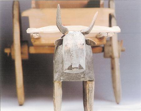 木牛俑高度約20厘米左右,通常先雕出輪廓,然后通體飾黑彩,白彩勾眼和絡頭等。從造型來看,木牛目視前方,屈背,四足蹬地,身軀健壯有力。拉著牛車或拉木犁的牛俑一般繪有絡頭,表現(xiàn)了田間勞作的情景。到西漢時期,隨著“軍事屯田”與“徙民實邊”政策的推行,牛耕技術在甘肅河西地區(qū)逐漸普及開來。