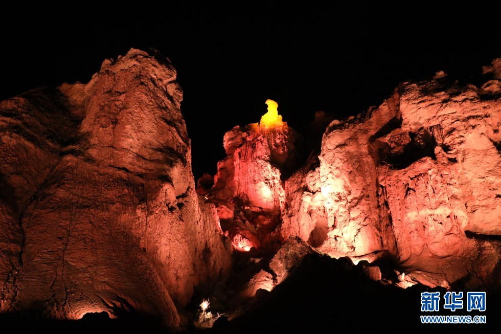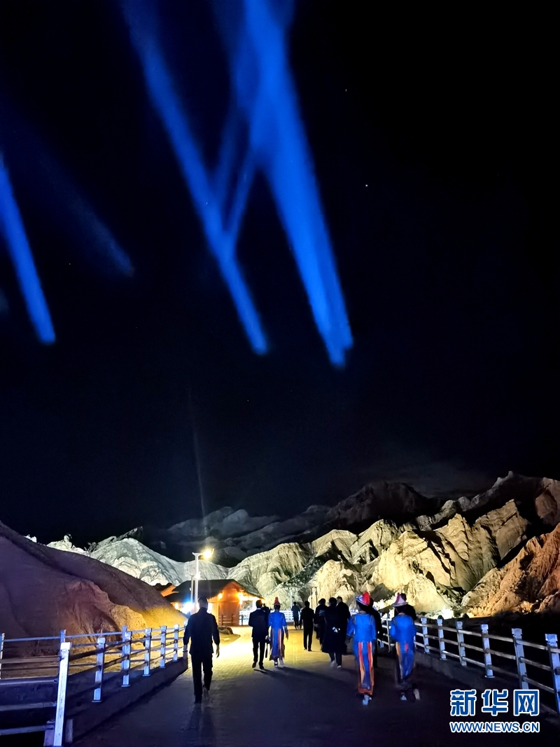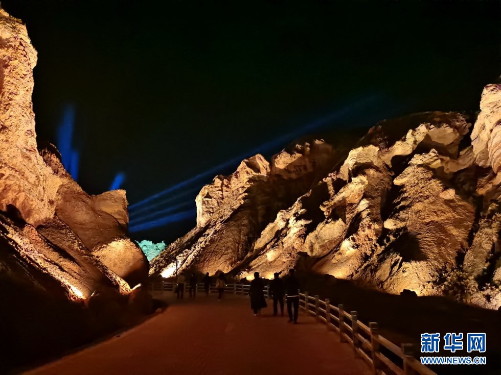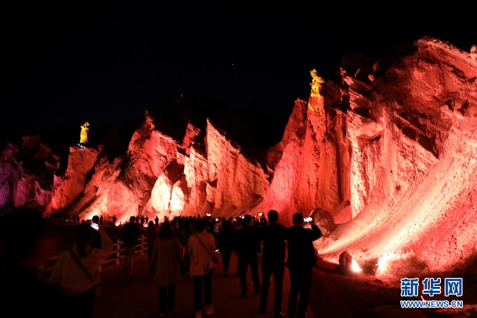張掖七彩丹霞景區(qū)萬象土林谷華燈閃爍。新華網(wǎng)發(fā)(童張偉 攝)