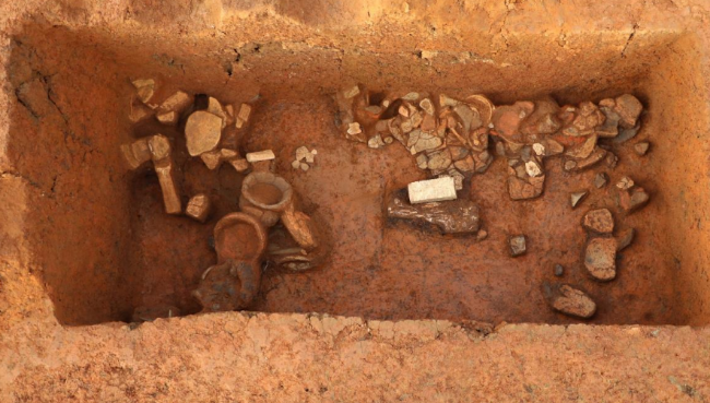 圪垯川遺址從仰韶文化早期延續(xù)至仰韶文化晚期,年代距今6100年至5600年。其中仰韶文化早期史家類型時(shí)期的大型環(huán)壕聚落保存較完好,面積約8萬(wàn)平方米,聚落外圍發(fā)現(xiàn)三道環(huán)壕,中心區(qū)為一處廣場(chǎng),圍繞廣場(chǎng)呈向心狀分布三組房屋,共計(jì)100余座,每組房屋由1座大房屋(約100平方米)和數(shù)量不等的中型房屋(約20-50平方米)、小型房屋(20平方米以下)組成。房屋間發(fā)現(xiàn)數(shù)座袋狀窖穴,最大一座位于中心廣場(chǎng),容積約60立方米,底部保存近0.4至0.6米厚的炭化粟黍遺存??碧桨l(fā)現(xiàn)環(huán)壕外東南部疑似有陶窯區(qū),西北部疑似有墓葬區(qū)。遺址出土大量陶器、石器、玉器、骨器等,陶器以彩陶為主,包括尖底瓶、平底缽、葫蘆瓶等,還發(fā)現(xiàn)一件玉權(quán)杖首。炭化植物遺存鑒定以粟黍?yàn)橹?,且以黍?yàn)槎唷?dòng)物骨骼遺存鑒定主要為家養(yǎng)動(dòng)物豬、狗和野生動(dòng)物鹿、狍等。