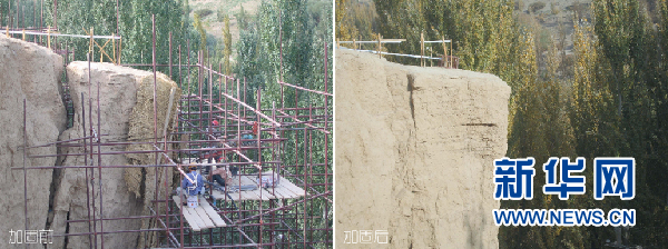 敦煌研究院古代壁畫與土遺址保護(hù)創(chuàng)新團(tuán)隊(duì)承接的新疆交河故城崖體加固項(xiàng)目前后效果對(duì)比(資料圖)。敦煌研究院 供圖
