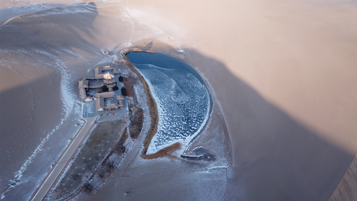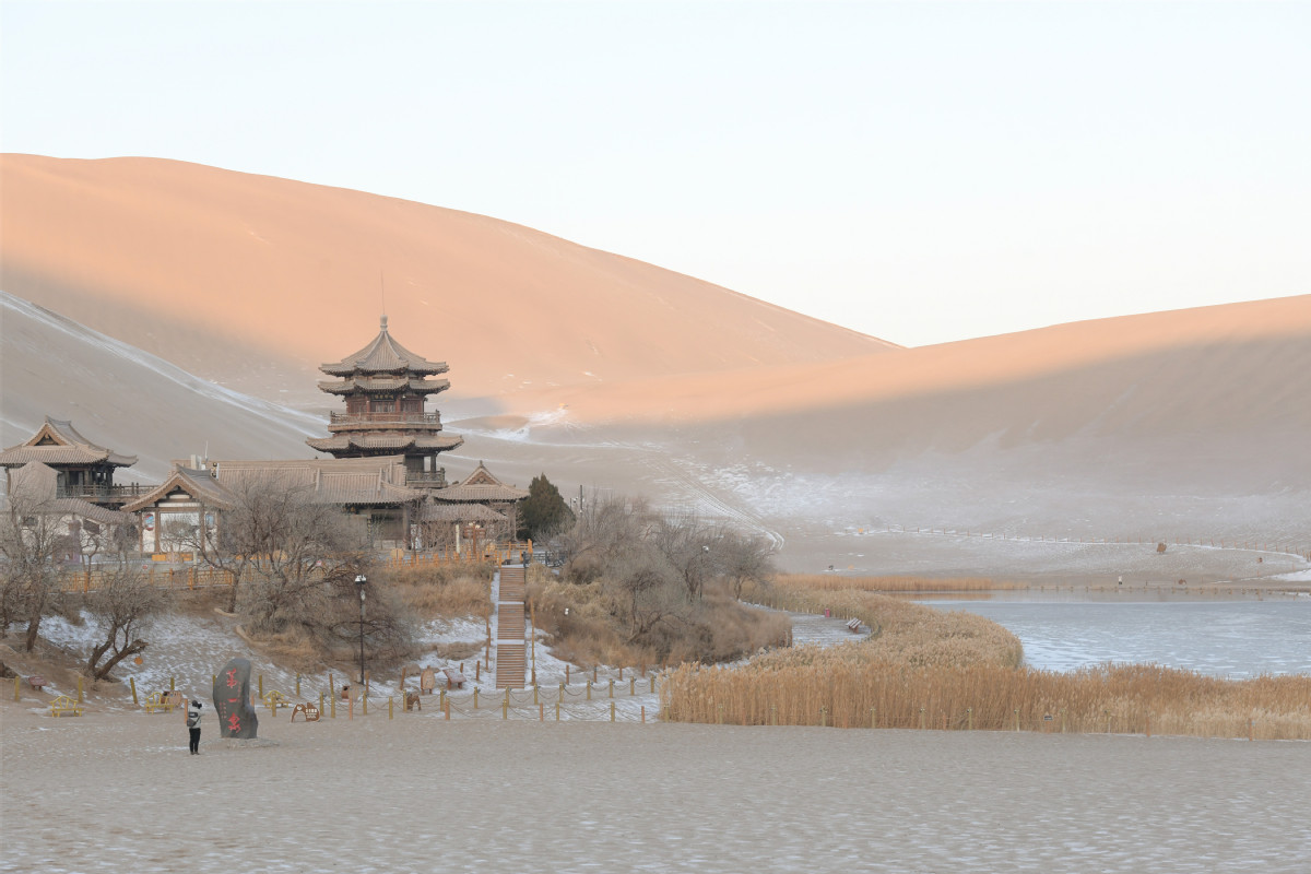 圖為:12月11日,落雪后的月牙泉靜美如畫。