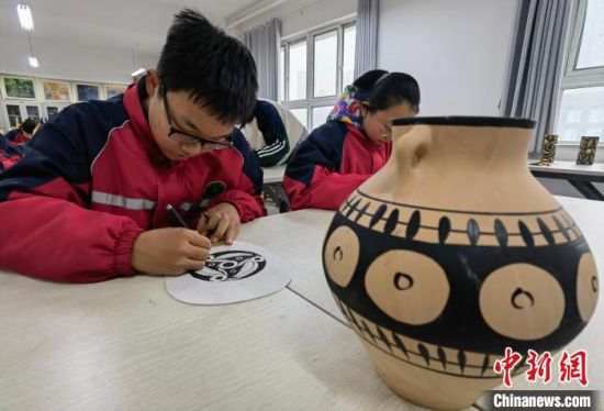 近日,中新社中新網(wǎng)記者走進(jìn)蘭州市第三中學(xué)“彩陶”課堂,學(xué)生正在繪制彩陶?qǐng)D案?!⒂裉摇z
