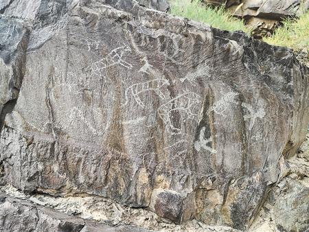 在嘉峪關(guān)四道鼓心溝巖畫《群虎圖》中,充分展現(xiàn)了生機勃勃的動物王國。5只猛虎隱藏在草叢中等待獵物的到來,蛇在草地上爬行,野牛、梅花鹿、北山羊迅速躲避虎群的襲擊,飛禽在空中翱翔。