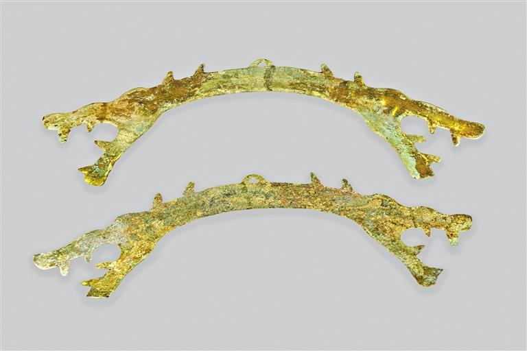 此套鎏金龍虎飾件中的虎飾件:長36.1厘米,寬9厘米;龍飾件:長41厘米、寬7.7厘米。為春秋戰(zhàn)國時(shí)期龍、虎形銅璜,圓拱形,頂部之上有拱形穿,兩端分別為龍首與虎首,口部張開,露出尖牙。在新石器時(shí)代,璜一般是佩戴于胸頸部的裝飾品,具有象征身份地位的作用。