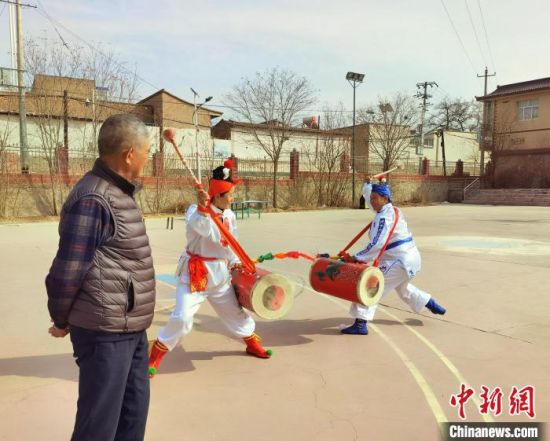 春寒料峭,中新網(wǎng)記者走進(jìn)蘭州市榆中縣金崖鎮(zhèn)陸家崖村,帶隊(duì)女子太平鼓隊(duì)近30年的陸鵬飛指導(dǎo)隊(duì)員訓(xùn)練。 張婧 攝