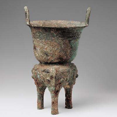侈口,細腰三款足,腰設(shè)活箅,口沿飾獸紋,足飾牛面紋。腹內(nèi)壁鑄有“勻”銘文。