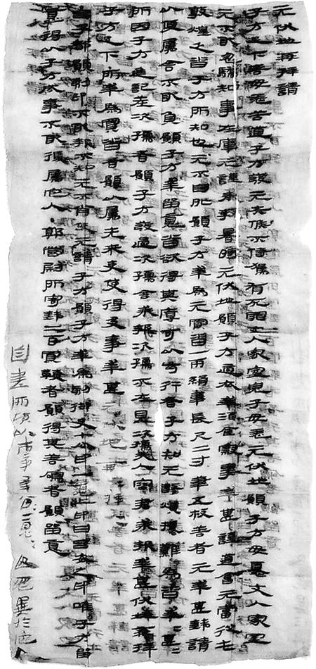 子方足下,善毋恙!苦道子方發(fā),元失候不侍駕,有死罪。丈人、家室、兒子毋恙,元伏地愿子方毋憂。丈人、家室元不敢忽驕,知事在庫(kù),元謹(jǐn)奉教。暑時(shí)元伏地愿子方適衣、幸酒食、察事,幸甚!謹(jǐn)?shù)溃簳?huì)元當(dāng)從屯敦煌,乏沓,子方所知也。元不自外,愿子方幸為元買沓一兩,絹?lái)f,長(zhǎng)尺二寸;筆五枚,善者,元幸甚。錢請(qǐng)以便屬舍,不敢負(fù)。愿子方幸留意,沓欲得其厚、可以步行者。子方知元數(shù)煩擾,難為沓。幸甚幸甚!所因子方進(jìn)記差次孺者,愿子方發(fā)過(guò)次孺舍,求報(bào)。次孺不在,見(jiàn)次孺夫人容君求報(bào),幸甚,伏地再拜子方足下!所幸為買沓者,愿以屬先來(lái)吏,使得及事,幸甚。元伏地再拜再拜!