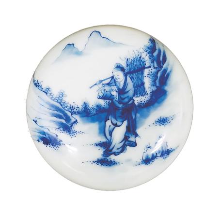 一件是青花印泥盒,制作于20世紀初。直徑7厘米,高3厘米,盒身扁圓,鼓腹,上下相合。盒蓋用青花繪“樵夫讀書”圖。畫面遠處,兩座山峰高聳云間,四周樹木蔥蘢,山石嶙峋。畫面正中的山路上,一樵夫砍柴歸來,身背一大捆柴草,他右手扶著木棍,左手則捧著一本書,雙眼盯著書本,緊抿嘴唇,正津津有味地邊走邊讀。讀到精彩處,露出會心一笑??磥恚@個樵夫是極愛讀書的,這種好學(xué)精神,難道不值得我們學(xué)習(xí)嗎?這件瓷印泥盒,青花色澤典雅,人物衣褶神態(tài)描繪細致,栩栩如生,胎體堅致,白釉溫潤,層次清晰,保存完好。