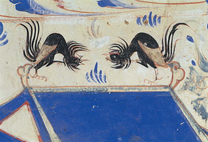 一對(duì)斗雞在屋頂對(duì)峙