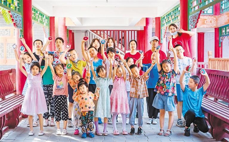 志愿者與參與“石頭畫(huà)”繪制兒童的合影