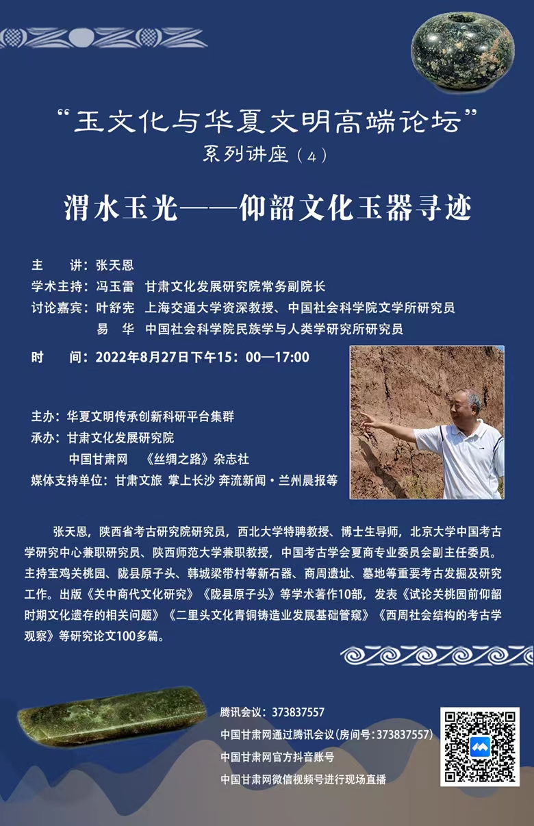 中國(guó)甘肅網(wǎng)8月28日訊  27日下午15:00—17:00,由西北師范大學(xué)華夏文明傳承創(chuàng)新科研平臺(tái)集群主辦,甘肅文化發(fā)展研究院、中國(guó)甘肅網(wǎng)、《絲綢之路》雜志社聯(lián)合承辦的“玉文化與華夏文明高端論壇”第四講《渭水玉光——仰韶文化玉器尋跡》成功舉辦。