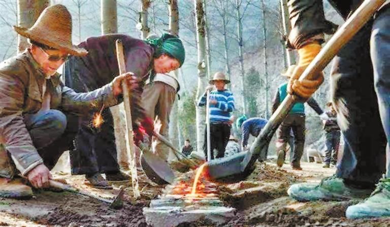 形狀神似燕尾的鏵,并非是由工匠在傳統(tǒng)的鐵匠鋪里鍛打而成,要知道,雍壩人的犁鏵生產(chǎn)場地頗具規(guī)模——村頭江邊的空地變成了一個偌大的生產(chǎn)車間,幾百人集體出動、密切協(xié)作,機器轟鳴,爐火升騰,進料的、揚爐的、撥碴的、取火的、出鏵的……男女老少齊上陣,吃飯喝水在工地,這樣熱鬧而忙碌的勞動場景頗為壯觀。