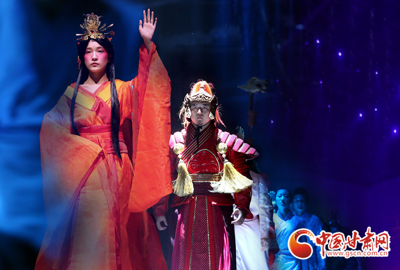 第一表演區(qū)里,T臺一般的大道實際上是意象化的絲綢之路,走過絲路、穿過黃沙,最令人感動的還是當張騫、張儀潮、米薇、王潮歌、叢明玲、張冬、王兒將……這些名字響起時,眾聲回答的那一聲‘在’,意味著今天民族文化的傳承者們同在。