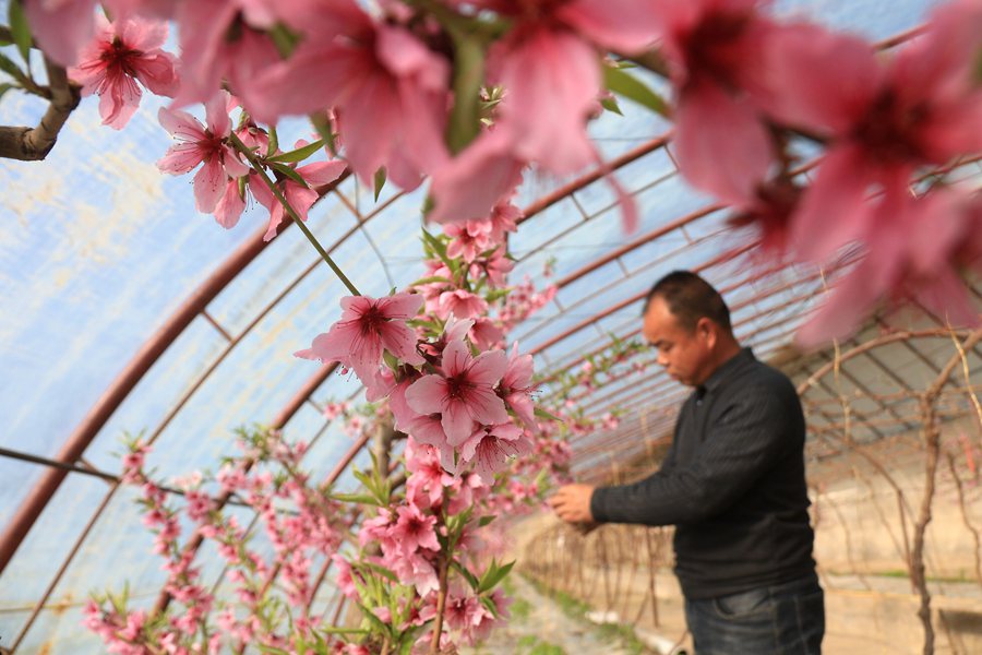 初春時節(jié),甘肅省敦煌市七里鎮(zhèn)戈壁設施農(nóng)業(yè)示范園區(qū)溫室中的桃花競相綻放,濃濃春意撲面而來,農(nóng)民忙著為桃樹壓枝、疏花,加強田間管理,為今年豐產(chǎn)豐收打牢基礎。