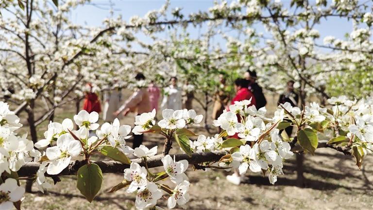 清新的花香映紅了游客的笑臉,有人在梨花樹下翩翩起舞,有人在梨花叢中游覽拍照,有人在梨花樹下放聲歌唱。梨花詩會如期舉辦,配樂詩朗誦《千古涼州》、藏族舞蹈《故鄉(xiāng)》、合唱《祝福祖國》、旗袍秀《飛韻江南》等眾多節(jié)目吸引了游客的目光。連日來,涼州區(qū)西營鎮(zhèn)2200畝梨花競相綻放,遠(yuǎn)處蜿蜒起伏的祁連山和眼前雪花般紛紛揚揚的梨花構(gòu)成了一幅美麗的鄉(xiāng)村畫卷。