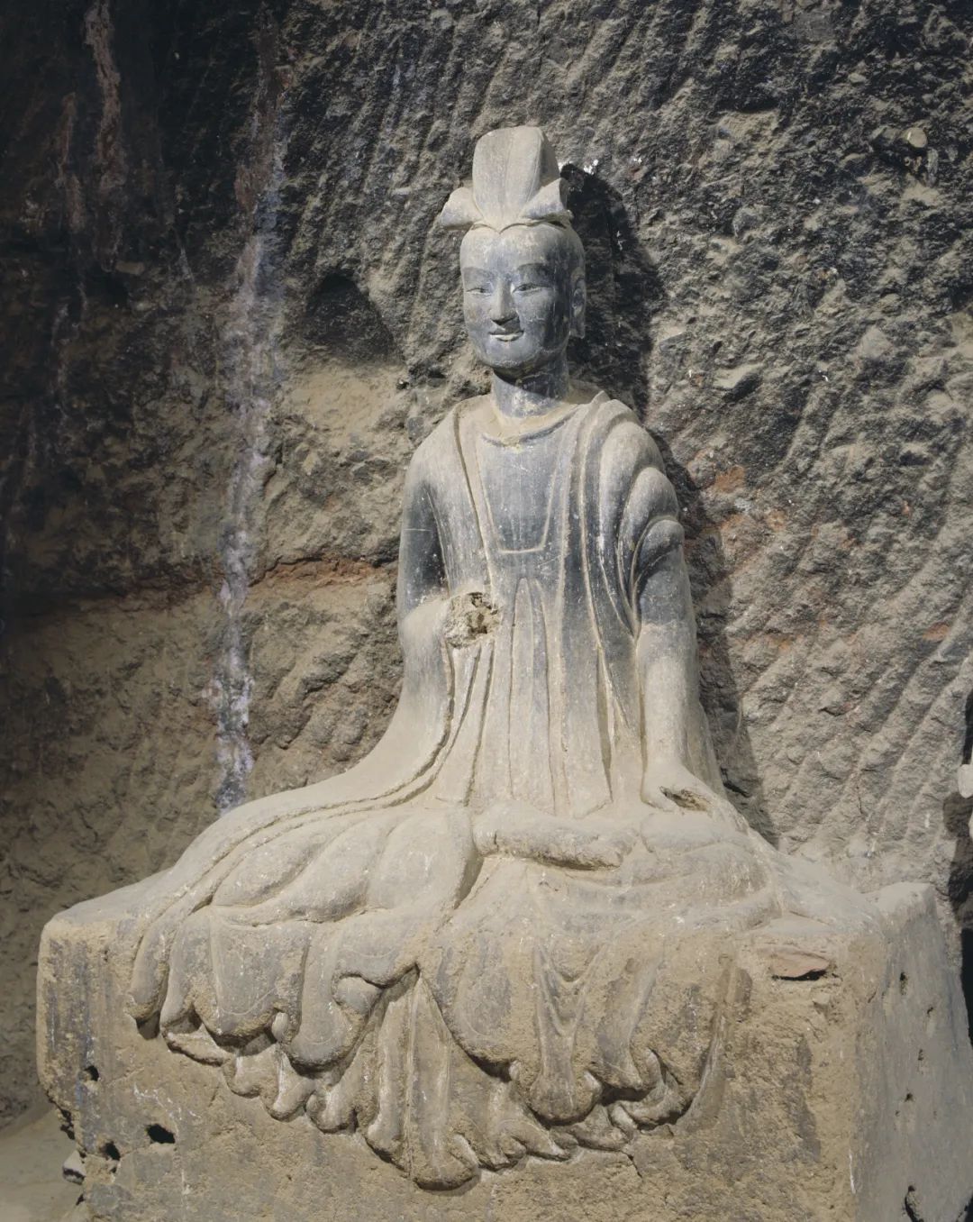 特別是佛像發(fā)髻和衣裾方面的變化尤為突出:樣式豐富的渦旋紋、水波紋和螺紋發(fā)髻交相輝映,八字形重疊衣裾和三片式衣裾并存,生動(dòng)再現(xiàn)了當(dāng)時(shí)南朝與中原地區(qū)不同佛教造像藝術(shù)樣式的交流與融合。