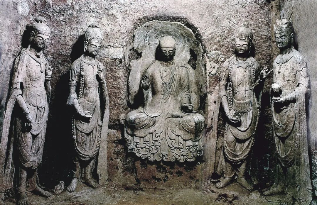 它一改西魏造像繁縟華麗、服飾厚重的特點(diǎn),無論是佛、菩薩、弟子,還是飛天和力士,服飾輕柔而貼體,均展現(xiàn)出一種雄健挺拔、恬靜自然的氣韻,面相方圓,五官清秀而緊湊。佛低平肉髻,身穿圓領(lǐng)通肩或垂領(lǐng)式袈裟,衣裾下擺緊貼佛座,陰刻圓潤(rùn)流暢的褶皺紋。菩薩也由束發(fā)高髻改為頭戴花冠,周身飾瓔珞,體姿婀娜而不失端莊。