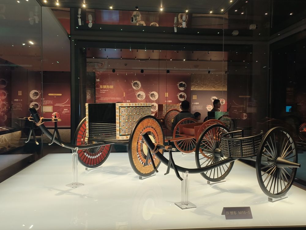 這些車輿依據(jù)張家川縣馬家塬遺址出土的車輛遺跡復制。馬家塬遺址是一處戰(zhàn)國晚期的西戎貴族墓地,共出土車輛遺跡69輛,隨葬品3600多件(套),2021年入選中國“百年百大考古發(fā)現(xiàn)”。