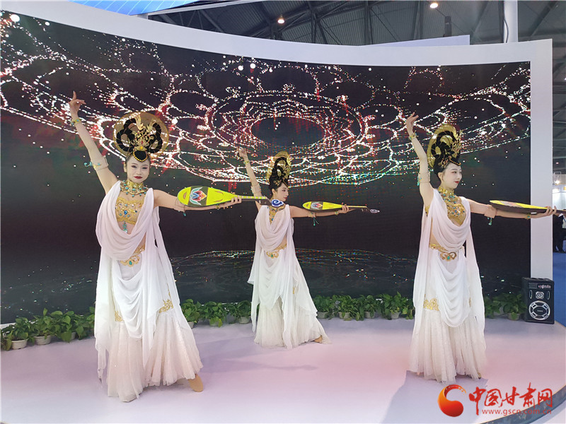 走進(jìn)甘肅特色版權(quán)館,敦煌文化元素濃郁。無(wú)論是展廳頂部的三兔共耳藻井,還是數(shù)字敦煌展區(qū)顯眼現(xiàn)代的四個(gè)大字,都在展示甘肅的敦煌元素。而展廳舞臺(tái)區(qū)更是以數(shù)字敦煌庫(kù)為背景,由舞蹈演員現(xiàn)場(chǎng)表演《妙音反彈》,讓觀眾走進(jìn)甘肅館,就能發(fā)現(xiàn)敦煌韻。