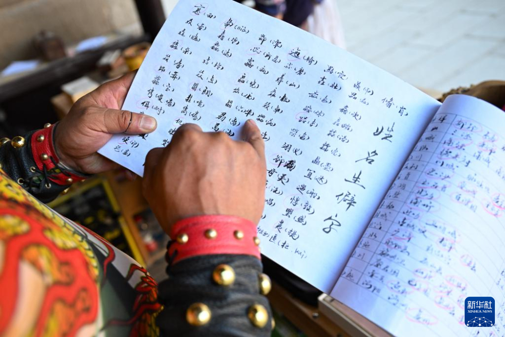 在甘肅嘉峪關關城景區(qū),李森在攤位上查閱自己編寫的含有生僻字讀音、城市古地名等內(nèi)容的小冊子(7月14日攝)。新華社記者 陳鐘昊 攝