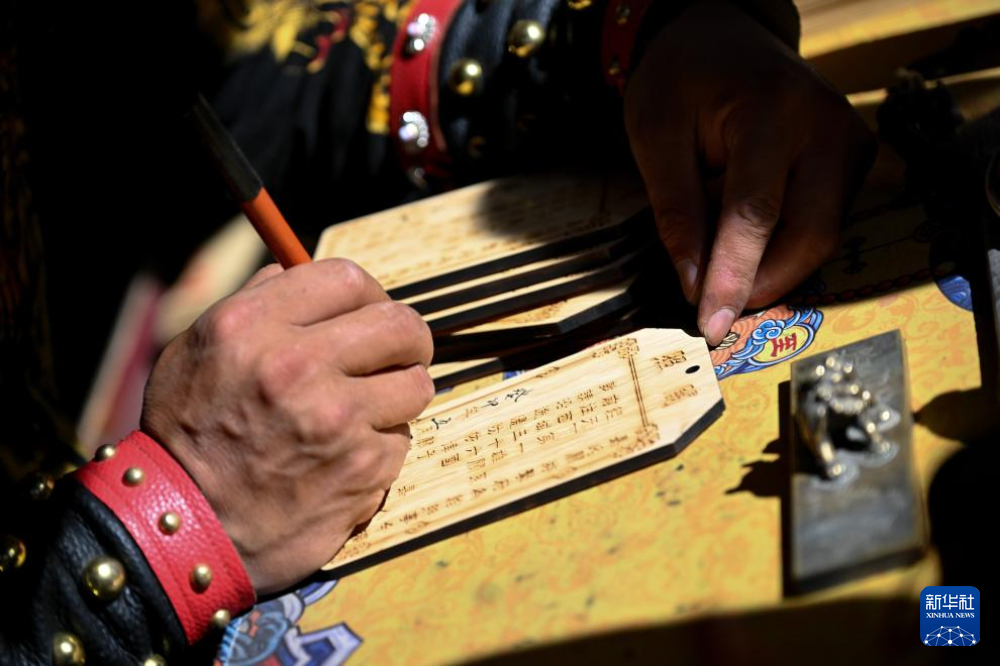 7月13日,在甘肅嘉峪關關城景區(qū),李森為游客手寫文創(chuàng)產(chǎn)品“關照”。新華社記者 劉金海 攝