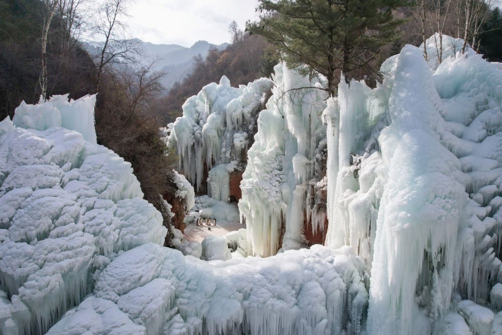 這是1月17日拍攝的渭源縣天井峽西部雪谷內(nèi)的冰瀑景象(無人機(jī)照片)。新華社記者 張智敏 攝