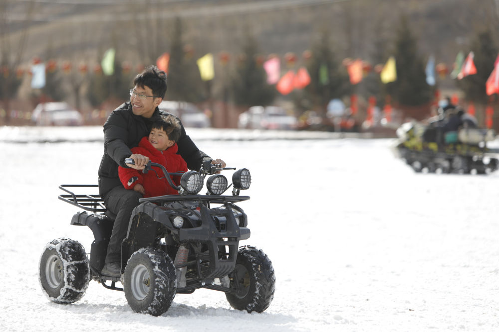 1月16日,在渭源縣田家河鄉(xiāng)元古堆村冰雪樂園,游客在體驗(yàn)雪地摩托。新華社記者 方欣 攝