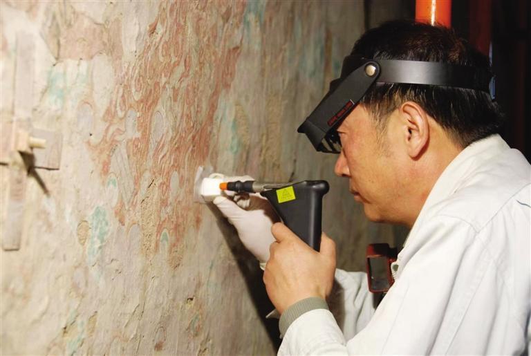樊再軒研究員在修復壁畫
