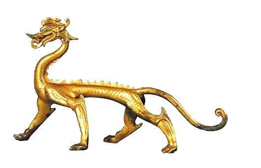 河南偃師的二里頭遺址出土了夏代龍文物,說明此時龍已經(jīng)成為身份、地位的象征。商代開始,龍的突出特征便是有了角,并多以夔龍紋等形象出現(xiàn)在青銅器上。春秋戰(zhàn)國時代是一個大變革、大發(fā)展的時代。與政治上諸侯爭雄、思想界百家爭鳴、陰陽學說盛行相適應,龍的圖案中出現(xiàn)了“群龍”和“交龍”形象。如甘肅省博物館收藏的戰(zhàn)國盤龍紋金飾片,兩條龍交叉盤繞,龍首一側飾兩條小龍,龍尾一側飾一對小虎,作咬噬龍尾狀,龍身上飾聯(lián)珠紋。隨著華夏大地結束戰(zhàn)亂,走向一統(tǒng),秦漢時代的龍出現(xiàn)相對規(guī)范和定型的趨勢,并出現(xiàn)了背上長翅膀的龍。魏晉南北朝時期龍形象對內(nèi)融合各少數(shù)民族文化,對外融合佛教文化,流行的龍紋頭部扁長,角似鹿角,發(fā)鬣后披,挺胸奮肢,呈現(xiàn)出矯健奔放、線條流暢、氣韻生動的特點。