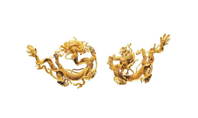 甘肅省博物館藏的明代累絲金龍,龍首聳額巨目,鬣發(fā)飛揚,神情兇猛;龍足屈伸相應,利爪如鉤;龍身似盤似舒,蜿蜒多態(tài);龍尾分叉,形狀如葉,輕輕擺動,飄帶般長須刻畫出金龍瀟灑自由的雄姿。