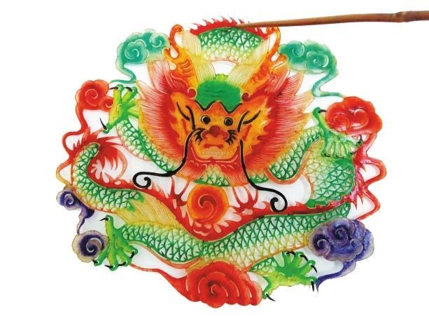 國(guó)家級(jí)非物質(zhì)文化遺產(chǎn)項(xiàng)目——皮影戲(環(huán)縣道情皮影戲)代表性傳承人高清旺,以當(dāng)?shù)剜l(xiāng)土風(fēng)情為素材,選用優(yōu)質(zhì)牛皮,經(jīng)過(guò)炮制牛皮、畫(huà)好樣稿、陰陽(yáng)雕刻、顏料上色、燙熨出水、裝訂完成等雕刻工藝流程,制作成了龍年大吉圖案。