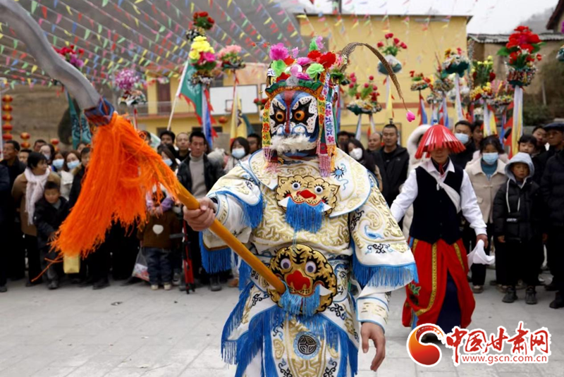 2024年2月19日,甘肅省隴南市武都區(qū)魚(yú)龍鎮(zhèn)柏家溝村,村民在表演當(dāng)?shù)靥厣珓》N、國(guó)家級(jí)非物質(zhì)文化遺產(chǎn)——高山戲。
