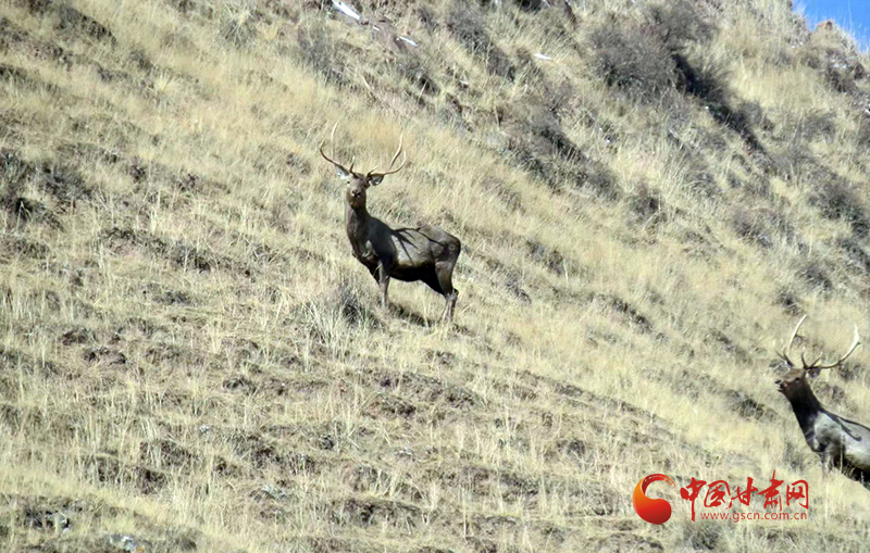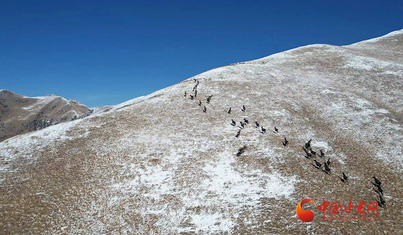 春日的祁連山仍有積雪覆蓋,大種群馬鹿沿著山坡覓食前行,時而漫步,時而奔跑,場面非常壯觀,成為保護區(qū)一道靚麗風(fēng)景,也給寂靜的山嶺增添了生機與活力。
