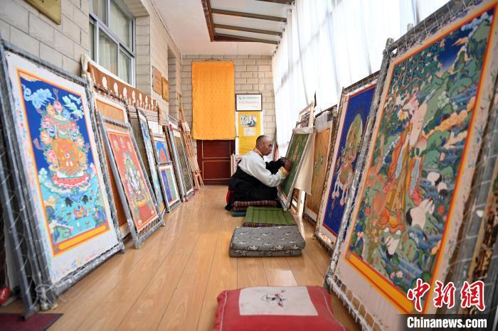 圖為交巴加布展示以拉卜楞寺為主題的唐卡作品。交巴加布不僅繼承了傳統(tǒng)唐卡技藝,更在創(chuàng)新中展現(xiàn)了個人特色。他結(jié)合現(xiàn)代審美和繪畫技巧,使作品既保留了傳統(tǒng)的韻味,又具有鮮明的現(xiàn)代氣息。這種獨(dú)特的藝術(shù)風(fēng)格使他的作品在眾多唐卡中脫穎而出,成為藏族民眾和藝術(shù)愛好者爭相收藏的藝術(shù)珍品。九美旦增 攝