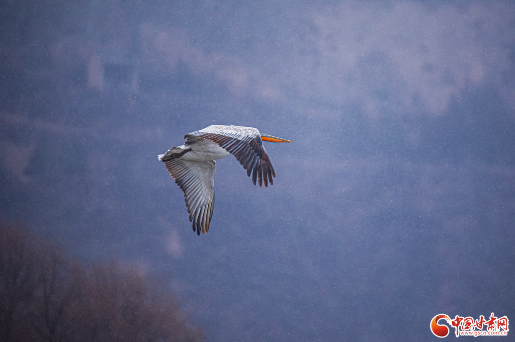 當(dāng)天,天空下著大雪,天氣寒冷,一位野生鳥類攝影愛好者驚喜地在崇信縣汭河段發(fā)現(xiàn)了一只卷羽鵜鶘盤旋于河道上空,經(jīng)過跟蹤其降落于發(fā)現(xiàn)地20里外的銅城水庫(kù)附近水域,與蒼鷺混群。