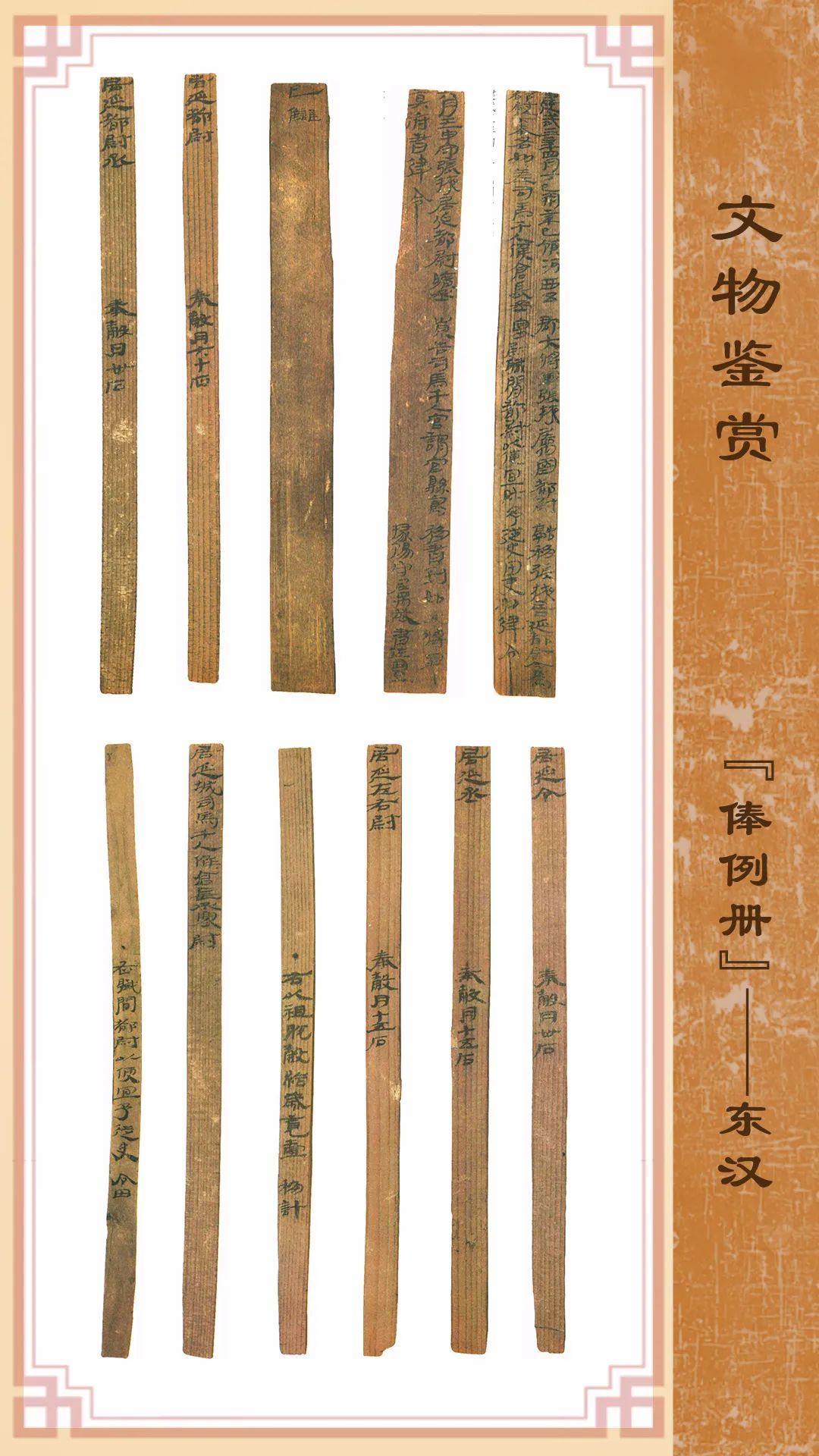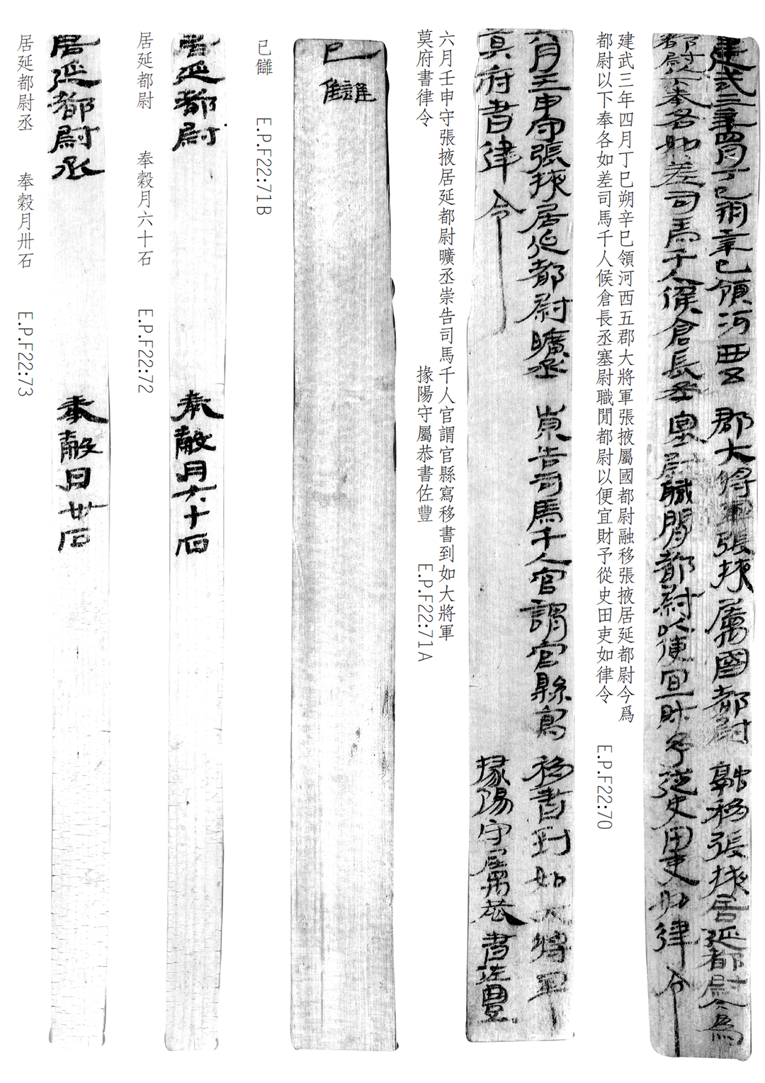 1974年8月出土于甲渠候官遺址第22號房址內(nèi)。簡冊由10枚簡組成,每簡長22.8厘米,前兩簡寬2.5厘米,其余8簡寬1.4厘米。全文200字。內(nèi)容為東漢建武三年(公元25年)竇融統(tǒng)治河西期間留下的一份完整的財政文書。簡文是關于居延都尉府吏員奉谷標準的通知,由領河西五郡大將軍張掖屬國都尉竇融幕府下發(fā),簡言“如律令”可知其指令具有法律效力。