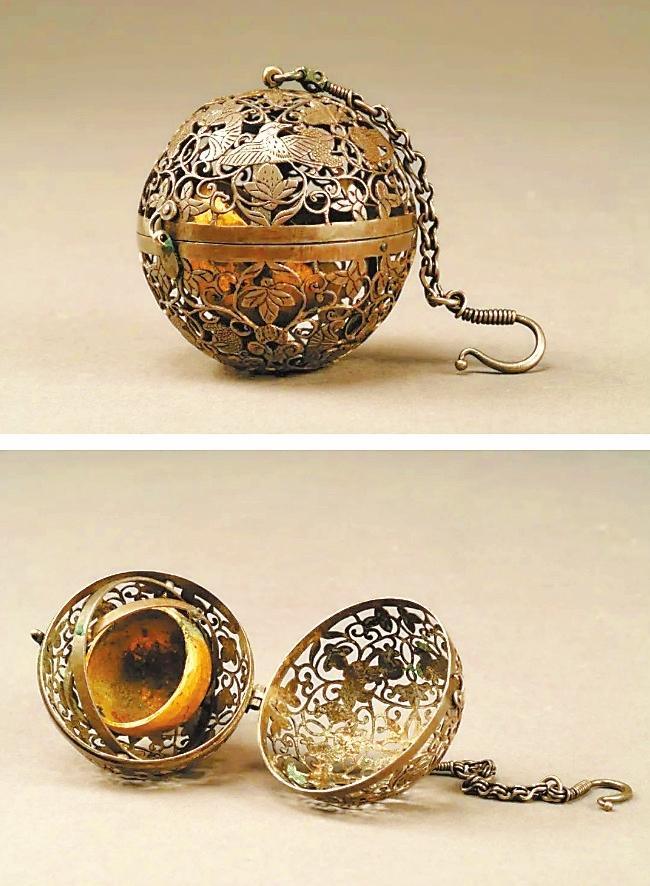 香囊最出彩的地方是機(jī)環(huán)常平架技術(shù),是一種利用球體內(nèi)兩個同心機(jī)環(huán)與中央焚香盂之間的重力作用,使其在自由轉(zhuǎn)動的時候,始終能保持平衡的機(jī)械原理。唐代的香囊豐富多樣,這種金屬造型的香囊設(shè)計更為機(jī)巧精致,深受妃后、貴婦們所推崇喜愛,它上承漢代的常平架技術(shù),下延現(xiàn)代陀螺儀萬向支架技術(shù),是中國古代科學(xué)技術(shù)與手工藝技術(shù)對世界的杰出貢獻(xiàn)。