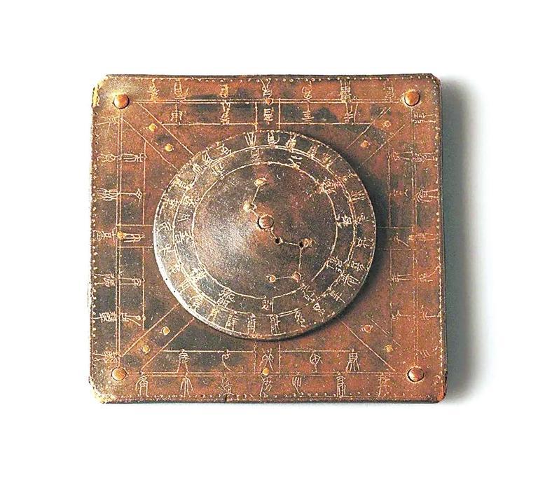 1972年武威市磨嘴子漢墓出土的這件漆栻盤,直徑6厘米,厚1厘米,地盤邊長9厘米,木胎,髹深褐色漆。由圓形的天盤和方形的地盤構(gòu)制而成,天盤位于地盤之上,正中心以竹軸貫聯(lián),使天盤可以轉(zhuǎn)動。天盤中陰刻兩個同心圓,將其分為三區(qū):內(nèi)區(qū)以竹珠鑲嵌北斗七星,星間刻線相連,斗柄中節(jié)穿過圓心。中區(qū)內(nèi)隸書陰刻十二月神,外區(qū)陰刻篆書二十八宿名。地盤以兩個相套的正方形分為三區(qū):內(nèi)區(qū)納天盤,中區(qū)陰刻篆書十天干中的八干(不刻戊己)和十二地支名,外區(qū)陰刻篆書二十八宿名。