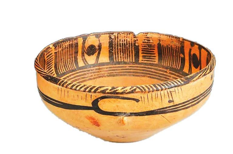 這件距今5000多年的古代彩陶作品,制作精致,圖案精美,人物形體鮮明,造型和動作既抽象又生動。彩陶盆通高11.3厘米,口徑24.5厘米,底徑9.8厘米,細(xì)泥制作,唇外侈,略鼓腹,腹部兩側(cè)有對稱的小鈕??谘貎?nèi)壁為四組雙人抬物圖案,中間以橫豎線條組成的幾何圖案間隔,形成一周四方連續(xù)的紋飾帶,繪制于陶盆內(nèi)側(cè)上部,二人的頭部以圓點(diǎn)代表,軀干和四肢以線條描繪。兩人相向站立,共同抬起一個碩大的圓形物體,畫面簡潔而生動,寥寥數(shù)筆就將人抬重物時雙腿開立、腰背微屈用力的形態(tài)刻畫得惟妙惟肖。陶盆上精妙的紋飾讓它成為我國最早在彩陶上表現(xiàn)原始先民勞作場景的藝術(shù)珍品。