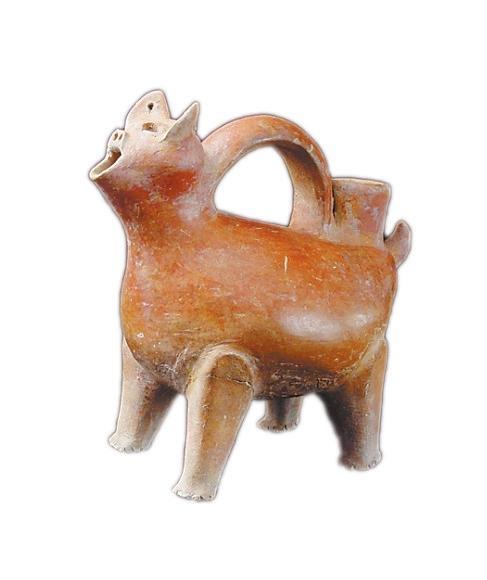 紅陶獸形壺,高21.6厘米,夾砂紅陶,通體磨光,遍施紅色陶衣,光潤亮澤。器型圓面聳耳,拱鼻,張口,耳穿小孔,四肢粗壯,短尾上翹,背裝弧形提手,尾根部一筒形注水口,嘴可往外倒水,腹部鼓起加大了容積,四足立起可供加熱,使用方便,造型生動美觀,集實(shí)用與仿生藝術(shù)于一身,是大汶口文化獨(dú)有的器形,充滿了創(chuàng)造性的靈感,是新石器時代一件難得的陶器珍品。