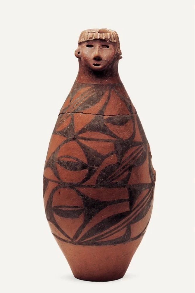 隴東少女作為甘肅的“顯眼包”之一,是曾在《國(guó)家寶藏》中出現(xiàn)過(guò)的“網(wǎng)紅”、甘肅省博物館鎮(zhèn)館之寶,它于1973年從秦安縣大地灣遺址出土。具有高度審美能力的“托尼”老師,設(shè)計(jì)了齊劉海發(fā)型,顯得很泰酷辣,圓鼓腹、平底,人們細(xì)看發(fā)現(xiàn),陶人的兩眼為圓孔洞,顯得目光深邃;鼻子呈蒜頭形,雕有鼻孔;嘴較小,微微張開(kāi),好像正在言語(yǔ);兩耳外展,皆有穿孔;瓶體從上至下以黑彩飾三層大小相同、由弧線(xiàn)三角紋和斜線(xiàn)組成的二方連續(xù)圖案,以示華麗的衣物。另外,陶瓶人頭像的器口運(yùn)用了不同的制作手法,頭發(fā)、嘴系雕刻而成,鼻、臉是捏塑而成。人頭像五官整齊、面龐秀麗,器身造型典雅,與人物形象渾然一體,既是大地灣文化彩陶的代表作,也是中國(guó)史前集彩繪、雕塑與造型藝術(shù)于一身的杰作。估計(jì)任誰(shuí)看一眼,都會(huì)被“她”的神秘和美麗所吸引吧。