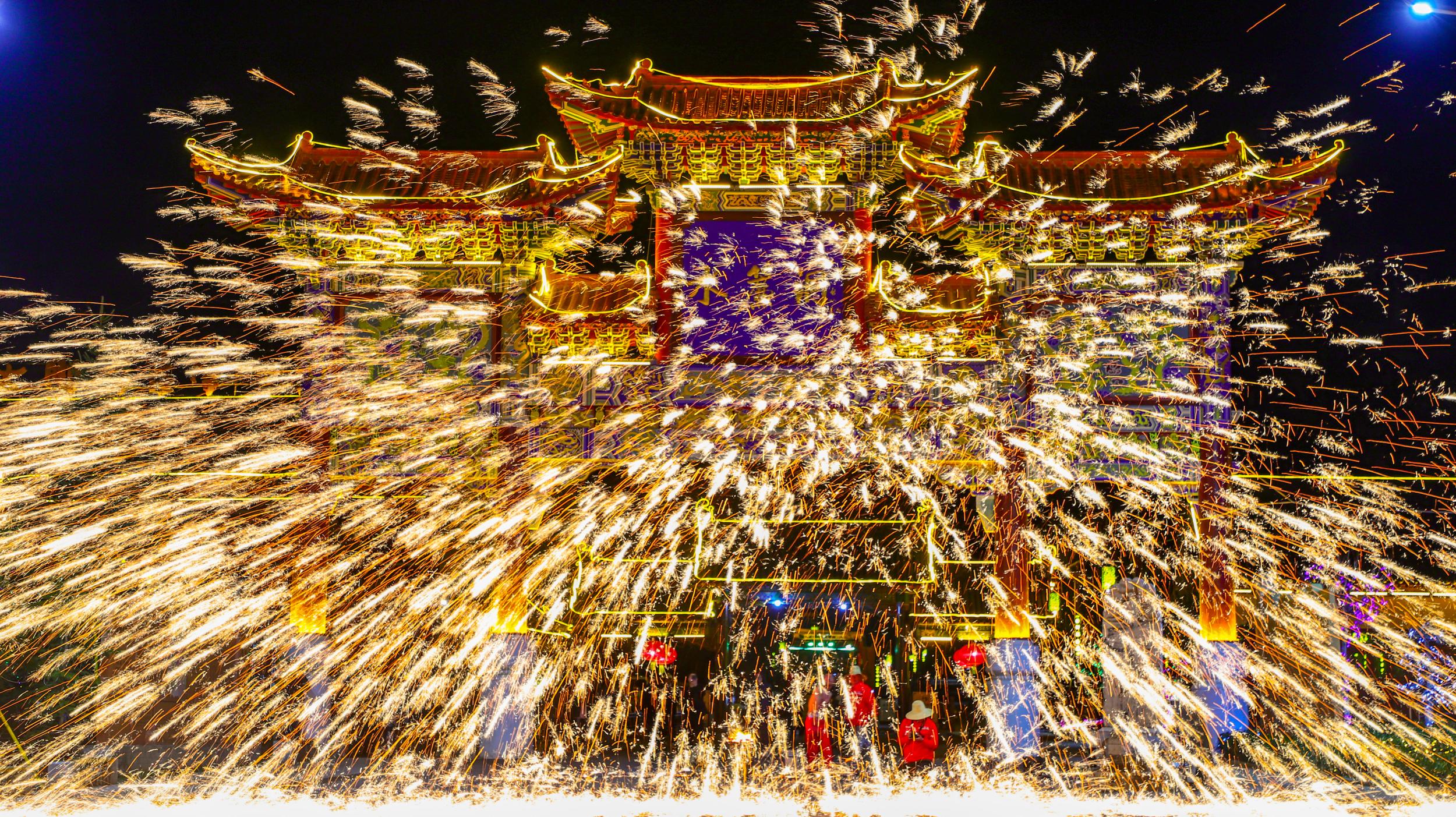 璀璨奪目的鐵花在空中綻放,場(chǎng)面十分壯觀。民眾在火樹銀花、星光璀璨之間感受著濃濃的中國(guó)傳統(tǒng)民俗文化。