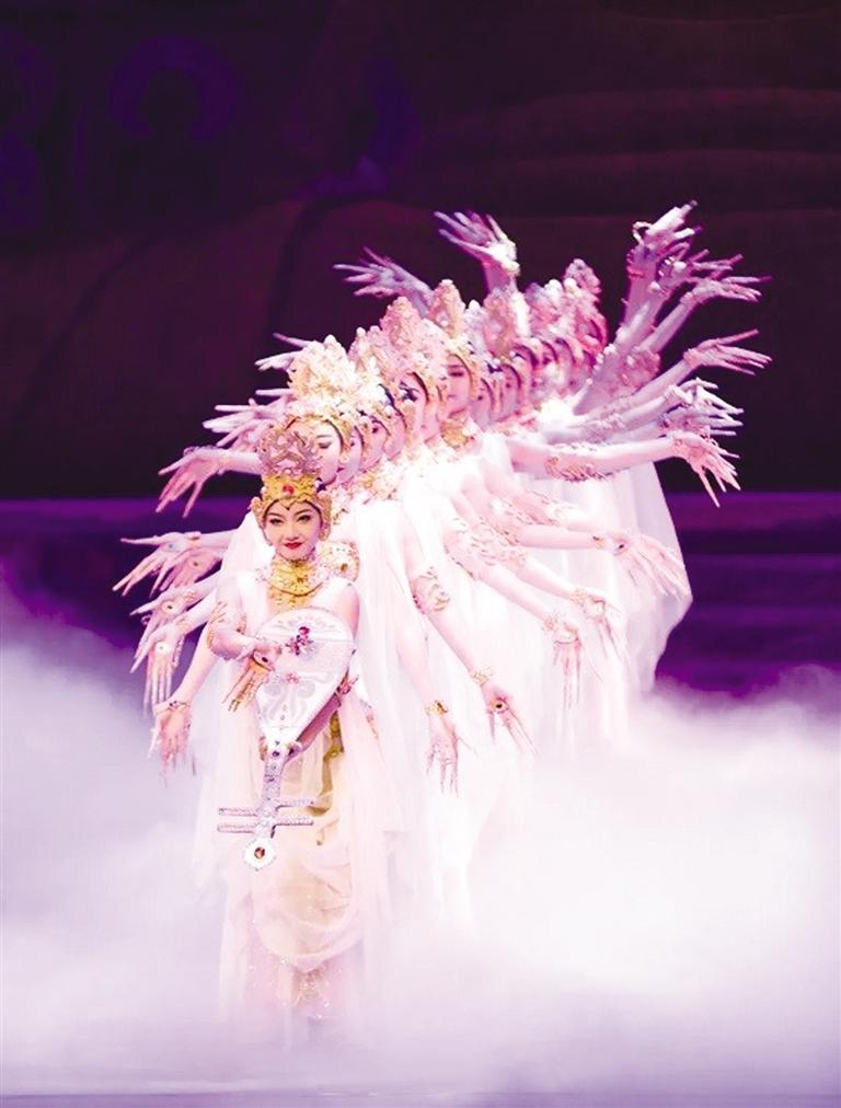 經(jīng)典舞劇《絲路花雨》歷經(jīng)45載,累計(jì)演出3952場(chǎng),觀眾達(dá)537.47余萬(wàn)人次,享有“中國(guó)民族舞劇的典范”“東方的《天鵝湖》”之稱。演出現(xiàn)場(chǎng),劇中經(jīng)典舞蹈選段《金光千佛》《反彈琵琶》《霓裳羽衣舞》《夢(mèng)幻伎樂(lè)天》為游客粉絲和廣大觀眾繽紛綻放,引發(fā)陣陣歡呼。“反彈琵琶”源自莫高窟第112窟的反彈琵琶樂(lè)舞圖,“千手觀音”還原了莫高窟元代3窟中的千手千眼觀音圖,“活著的敦煌壁畫”、獨(dú)創(chuàng)的“S”形舞姿讓游客沉浸式感受絲路文化藝術(shù)的魅力。