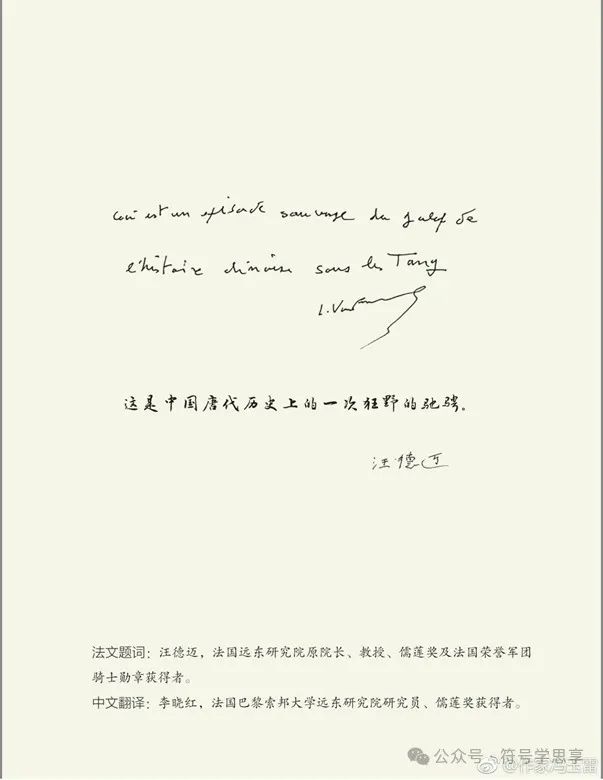 汪德邁先生對于馮玉雷這部作品給予高度評(píng)價(jià),2018年專門題辭:“這是中國唐代歷史上的一次狂野的馳騁。”馮教授專門把汪德邁先生給他的法文與中文題辭作為題簽印在書封面上,他多次跟我說:“幸遇汪德邁教授、李曉紅教授,受益良多,感激之情,難以言表。”