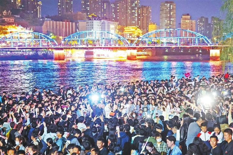 作為蘭州的地標(biāo)之一,中山橋已經(jīng)是來蘭游客必“打卡”的景點(diǎn)?;馃?ldquo;出圈”的“黃河大合唱”成為蘭州旅游新體驗(yàn)。華燈初上,游客和市民齊聚黃河岸邊,隨著音樂齊聲合唱,場(chǎng)面壯觀,氣氛熱烈。“五一”假期首日,蘭州文旅市場(chǎng)迎來火爆“開門紅”,接待游客達(dá)到了86.42萬人次。