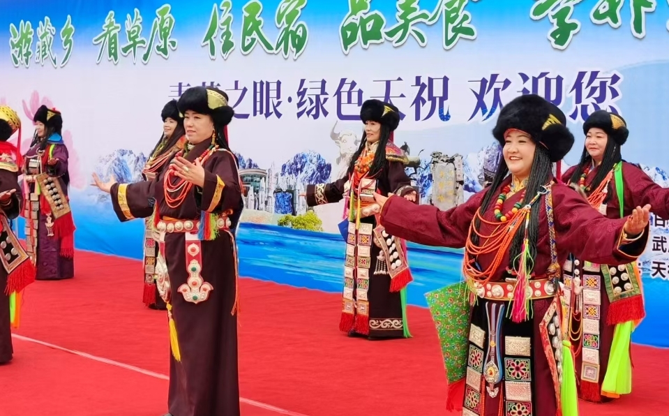 在天祝縣抓喜秀龍阿尼嘎卓帳篷城,身著藏族服飾的美麗卓瑪向采風(fēng)團獻上了潔白的哈達(dá),華銳藏歌、華銳則柔、華銳鍋莊等獨具特色的文藝演出讓現(xiàn)場觀眾拍手稱贊。